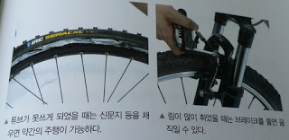 - 타이어가 말랑말랑해질 때까지 공기를 주입한 다음, 양손으로 좌우 허브를 쥐고 바퀴를 돌려 타이어가 제자리에 잘 들어갔는지 확인한다. 틀어진 부분이 있으면 손으로 잡고 좌우로 비틀면서 제자리를 잡게한다. 이상이 없으면 밸브 너트를 잠그고 공기를 끝까지 넣는다.