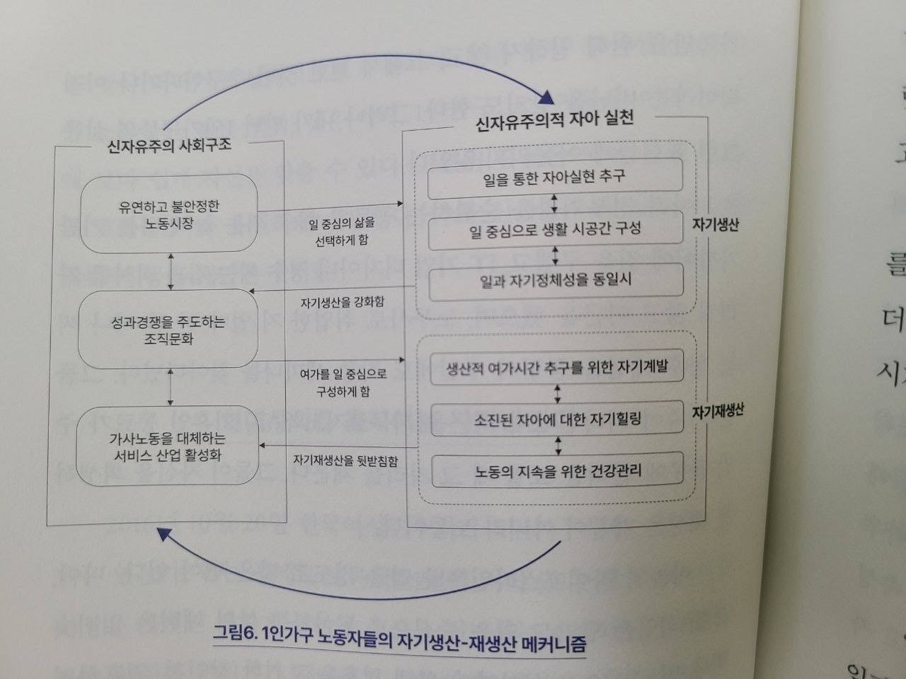 1인가구의 일상을 들여다보면 하나의 긴밀한 순환구조가 보인다(위 그림). 바로 후기 자본주의 시대를 살아가는 1인가구 노동자들의 자기생산-자기재생산 메커니즘이다. 이를 그리면 신자유주의 경제구조와 신자유주의적 자기실천이라는 톱니바퀴들이 맞물려 돌아가는 정교한 시스템이 완성된다. 불안정한 노동시장과 성과 중심의 조직문화에서 살아남기 위해 자기계발에 매진하고 일을 자아실현의 통로이자 자아정체성으로 여긴다. 성과경쟁으로 소진된 마음은 자기힐링으로 재생시킨다. 될 수 있으면 쓸데없는 에너지를 소모하지 않기 위해 직장 가까이에 살고 타인과는 거리 두는 삶을 택한다. 전통적인 재생산 활동인 가사를 최소화하기 위해 서비스 플랫폼이나 원가족에게 외주화한다. 거대한 사회구조가 우리를 감싸고, 우리 각자는 이를 온몸으로 받아낸다. 이 현대사회의 자가발전기 안에서 노동자들은 끊임없이 자기를 생산하고, 소모하고, 재생산하며 쳇바퀴를 돈다. 그렇게 가족이 더 이상 노동의 동기가 되지 못하는 혼자의 시대에서도 자본주의의 시계는 멈추지 않고 돌아간다.