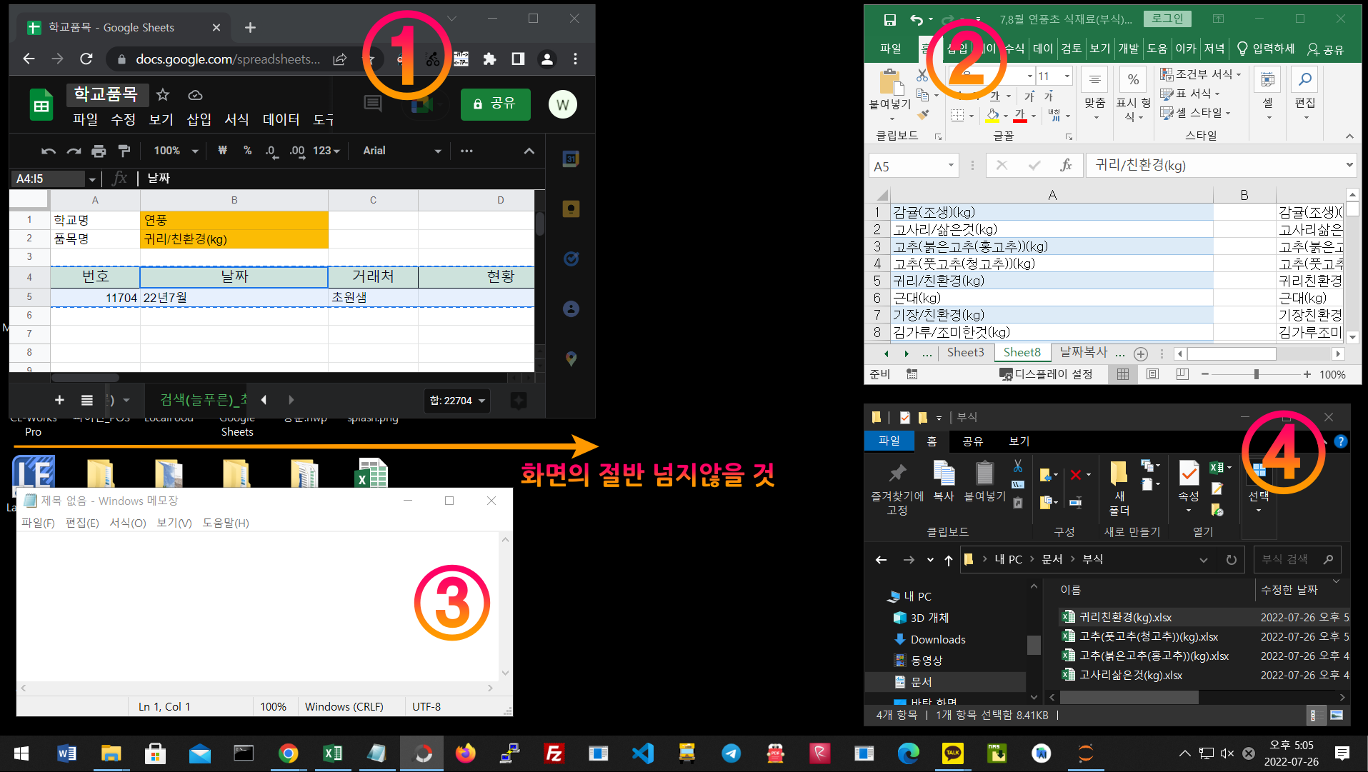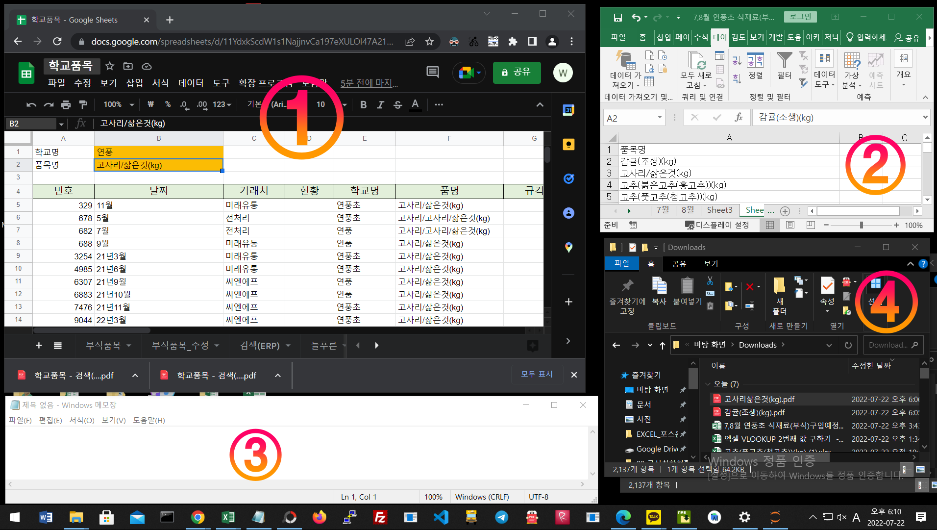 - 1번 윈도우에서 품목명으로 검색한다. 결과값을 5번 윈도우(엑셀)에 복사한다. 저장하고 파일을 닫는다.