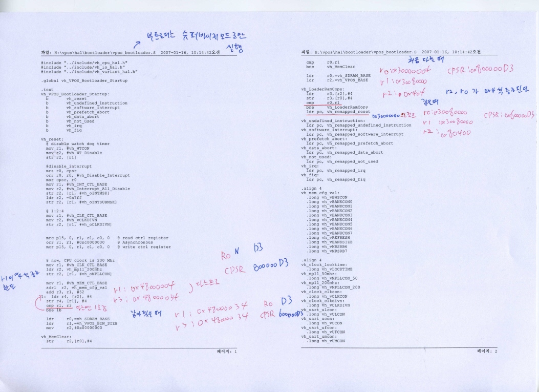 가장 먼저 호출되는 1 에서는 하드웨어를 초기화하고, VPOS 커널을 메모리상으로 복사하고 PC 를 메모리의 처음 주소로 설정하는 일을 한다.