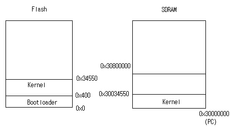 위의 주석에서도 보듯이 부트로더에서 가장 마지막으로 수행되는 것이 pc 를 0x30000000 으로 옮기는 것이다. 바로 0x30000000 에는 커널이 있다.