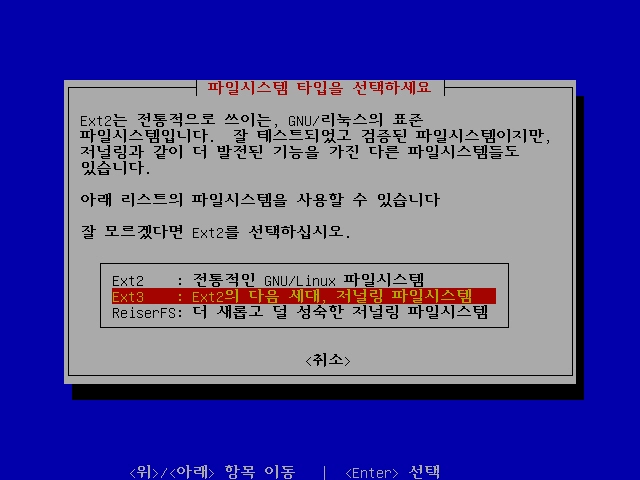 데비안에서는 총 3개의 파일시스템을 지원한다. 젠투나 레드햇에 비하면, 좀 아쉬운 감이 없지 않지만 다음 버전을 기대해보도록 하자. 우선 여기서는 'Ext3'를 선택한다.