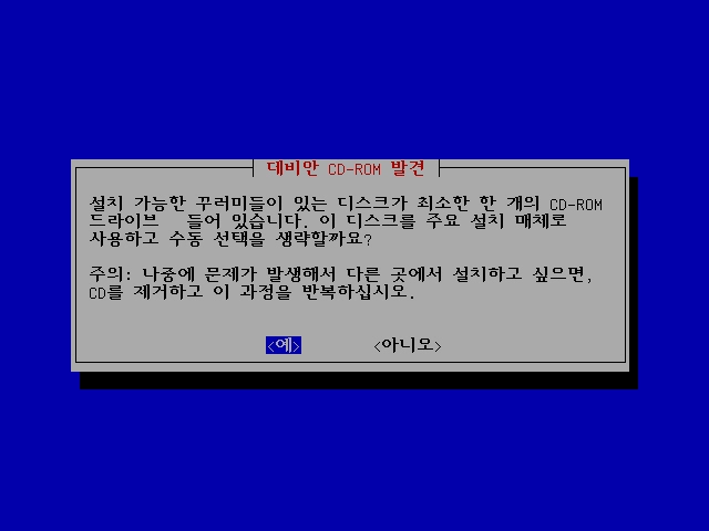데비안은 미러사이트에 가보면 알겠지만, 몇장(?)의 CD로 이루어져 있다. 하지만, 설치하는 데는 한장만 있어도 된다. 만일 다른 CD가 있다면, 'Yes'를 선택해서 읽어들이도록 한다. 여기서는 'No' 선택한다.