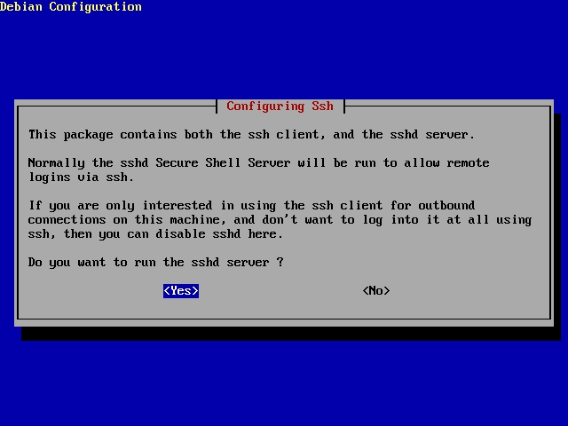 sshd 서버를 실행시킬지 여부를 묻고 있다. 여기서는 'Yes' 선택한다.