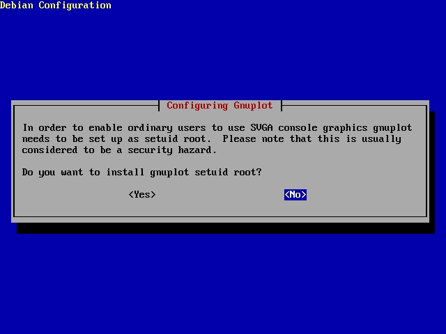 gnuplot를 setuid root로 설치할 것인가를 묻고 있다. 여기서는 'No' 선택한다.