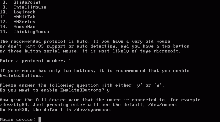마우스 장치를 지정해주는 부분이다. 앞에서 것과 같이 그냥 'Enter' 치고 넘어가면 기본적으로 '/dev/sysmouse' 로 설정된다.