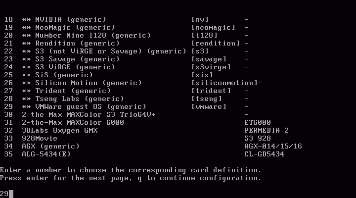 나의 경우는 vmware를 사용해서 설치를 하고 있기 때문에 '29. VMWare guest OS (generic)' 을 선택했다. 예전에는 xfree86에서 vmware을 지원하지 않았기 때문에, 설치후에 vmware-tool 을 설치해서 따로 잡아주어야 했지만, xfree86 4.3.x 에서 부터는 공식적으로 지원하고 있다. 참 좋아졌다. ^^;