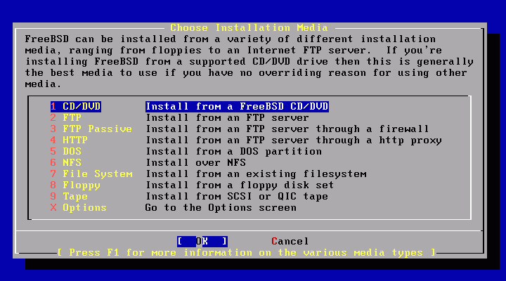 설치할 매체를 지정해주는 부분이다. 보다시피 프비는 여러가지 설치매체를 지원한다. 앞에서 우리는 CD로 구웠기 때문에 'CD/DVD' 를 선택한다.