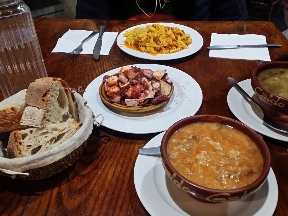 <갈리시아 지방에서 유명하다는 문어요리, 뽈뽀(가운데). 그리고 된장국 비슷한 맛의 갈리시아 스프(오른쪽 하단)>