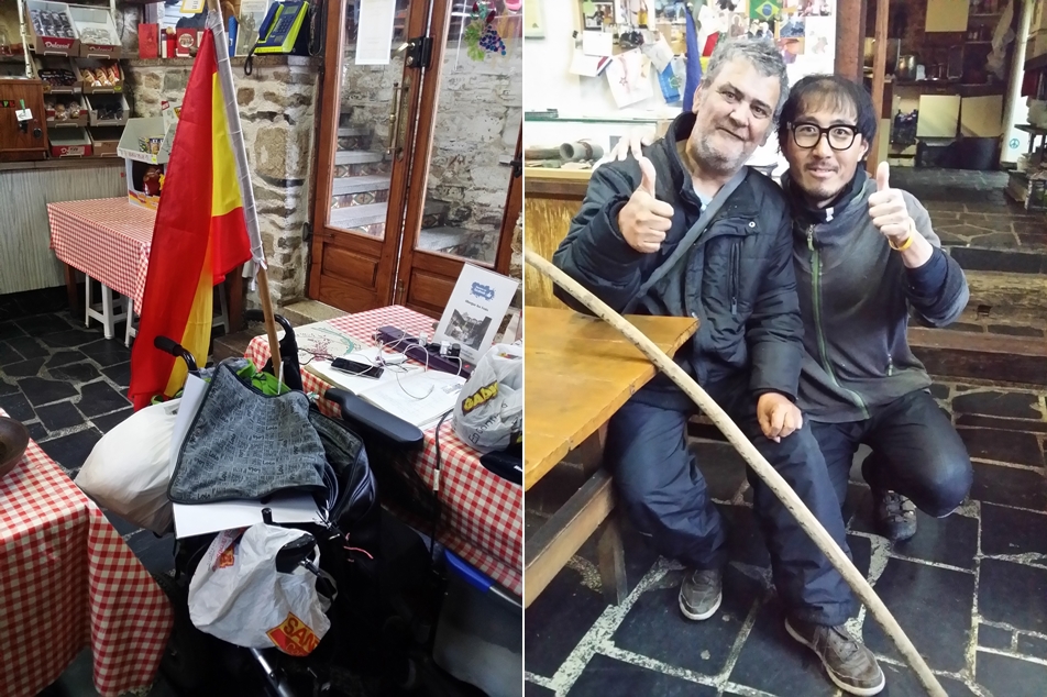 PS. 출발하기전 숙소에서 전동 휠체어를 타고 순례하는 스페인 순례자를 만났다. 걷기에도 힘든 길을 어떻게 왔을지 상상하기 어려웠다. '당신 참 대단해요' 라는 뜻을 제대로 전달할 수는 없었지만, 즉석해서 사진 찍자고 청했다. 그리고 엄지 척!