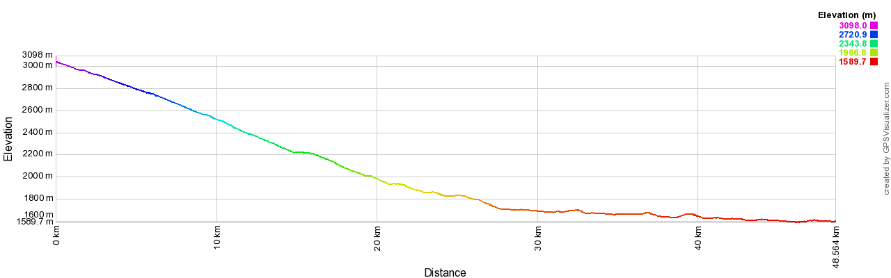 출발할 당시만 해도 고도 3200m. 바람이 불어 상당히 추웠지만, 내려갈 수록 따뜻해지더니, 급기하 덥기까지 했다.