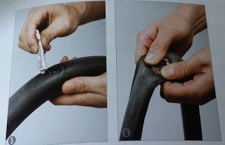 - 본드가 마르기 전에 패치를 붙이고 타이어 레버 등으로 꾹꾹 눌러준다. 패치가 완전히 붙은 다음, 패치에 붙은 비닐을 떼어낸다. 본드가 필요없는 파스 형태의 패치도 나와 있다.