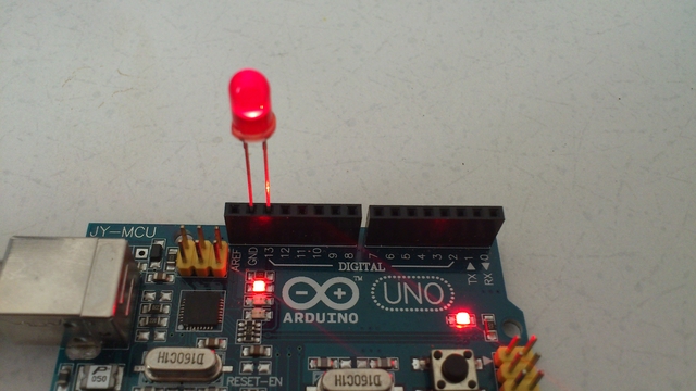 핀에 흘리는 전류를 High(1) 이나 Low(0) 로 조절하여 이를 LED 로 확인해보자. 먼저아래의 코드를 작성하여 컴파일하여 아두이노에 올려보자.