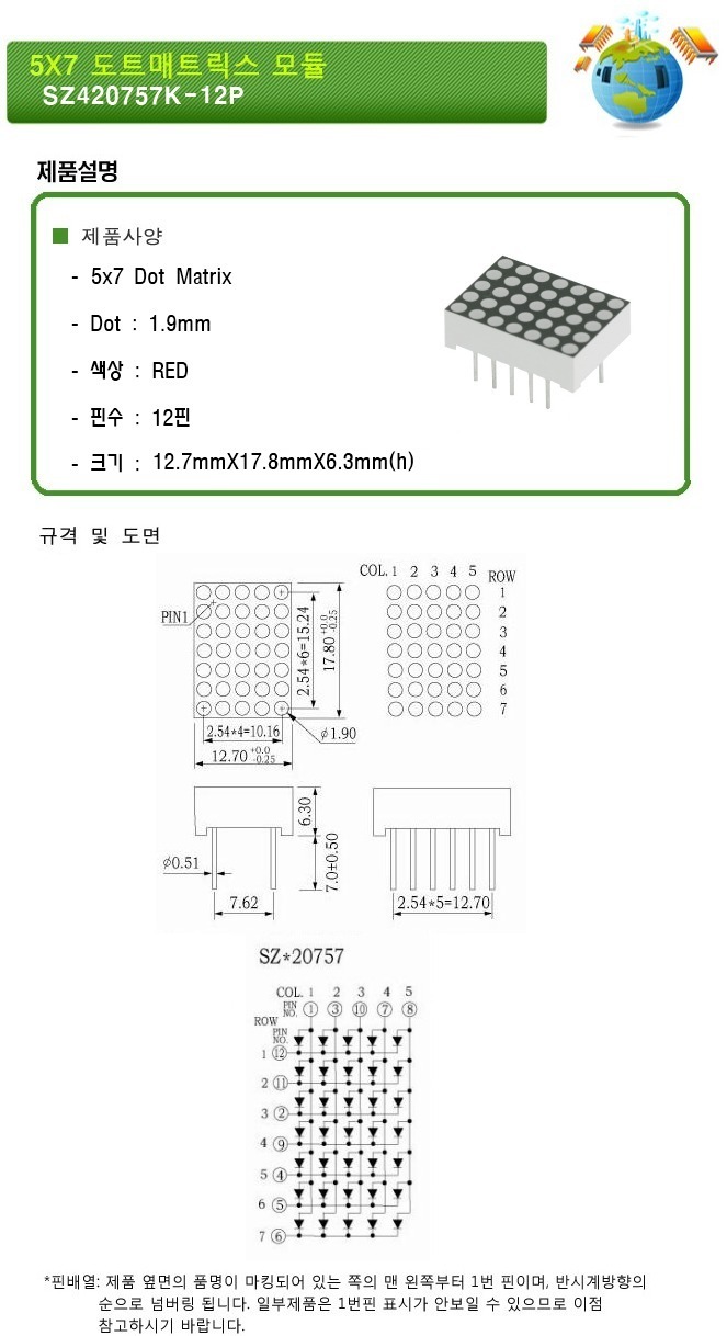 도트 매트릭스 역시 여러가지 종류가 있다. 여기서는 5(가로) * 7(세로) 크기의 LED 를 사용한다. 아래 데이터시트를 참고한다.