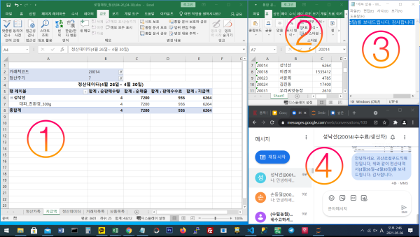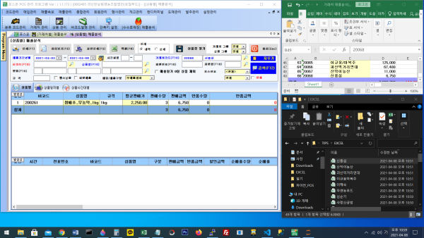 - 총 3개(포스관리프로그램, 거래처매출분석 엑셀프로그램, 엑셀저장디렉토리) 창을 위 사진처럼 띄워놓는다.