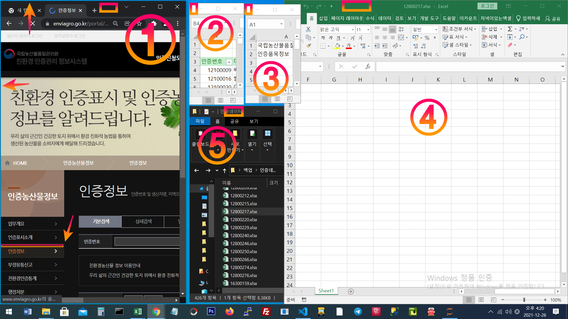 | 3 | 엑셀파일 생성 A1(국립농산물품질관리원), A2(인증품목정보)를 입력한 윈도우 |