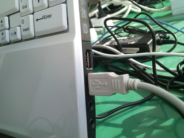 준비한 USB-to-RGB Dongle 을 연결한다. '이때 주의할 점이 있다. 나의 경우, USB 허브에 꽂았을 때, 제대로 동작하지 않고 메인 USB 포트에 꽂았을 때만 제대로 동작하였다. 아마도 전원문제인 것 같다. 따라서 USB-to-RGB Dongle 사용시에는 USB 허브를 빼고 메인 USB 에 USB-to-RGB Dongle 을 꼽는다.'