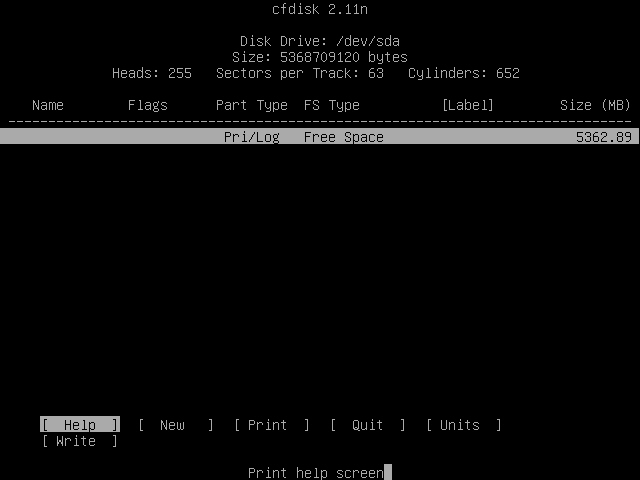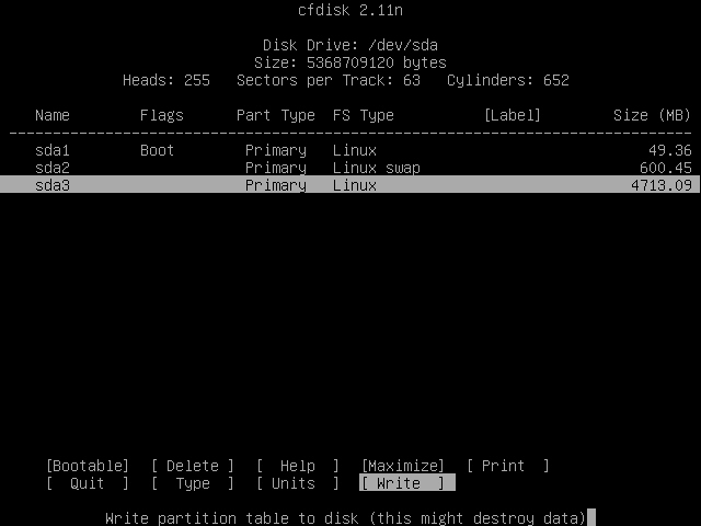 나는 총 3개의 파티션을 나누었다. 각각 /boot(50M) , swap(600M) , /(나머지모두) 각자 자기의 분수(?)껏 지정하기 바란다. 모두 지정이 끝났으면 파티션을 저장하기 위해 'WRITE'를 선택한다.