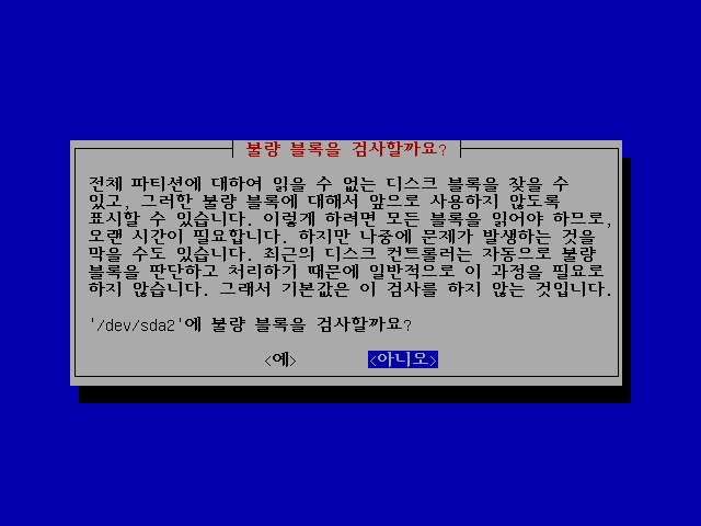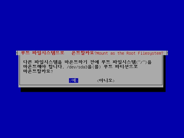 루트(/) 파티션이 아니기 때문에 '아니오'를 선택한다.