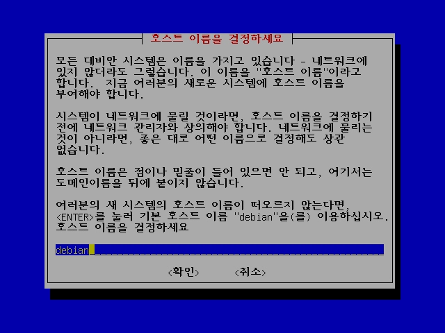 설치할 PC의 호스트 이름을 정해준다. 잘 생각이 나지 않는다면, 그냥 'debian'으로 정해주자!
