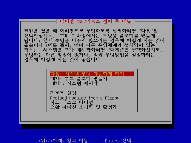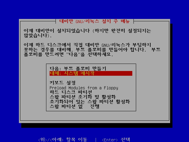 부트 플로피는 만들어도 되고, 만들지 않아도 된다. 이제 기본적인 설치가 끝나고, 시스템을 재시작하는 일만 남았다.
