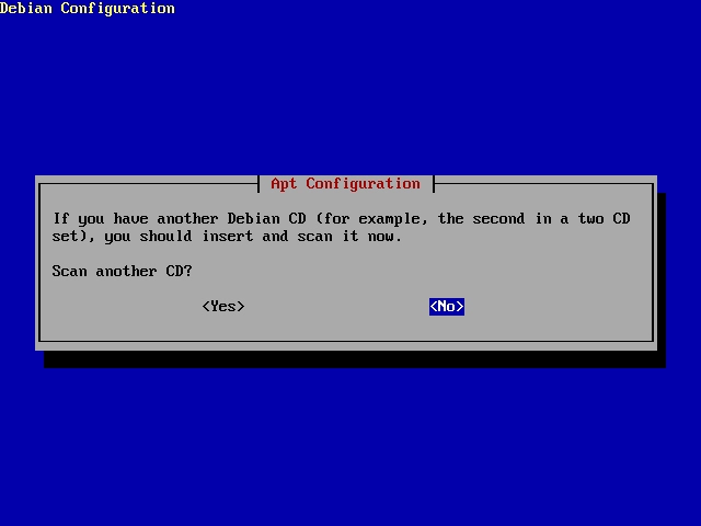 데비안은 미러사이트에 가보면 알겠지만, 몇장(?)의 CD로 이루어져 있다. 하지만, 설치하는 데는 한장만 있어도 된다. 만일 다른 CD가 있다면, 'Yes'를 선택해서 읽어들이도록 한다. 여기서는 'No' 선택한다.