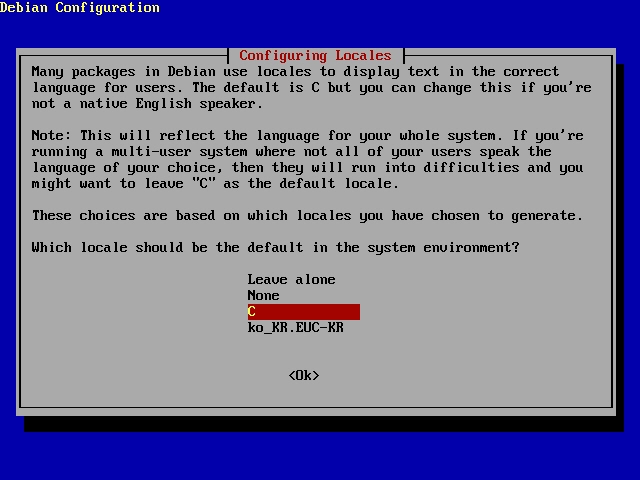 시스템에서의 기본(default) 로케일을 어떤 것으로 할지 지정해주는 부분이다. 앞에서 'KR' 로 설정했지만, 대부분의 프로그램들이 'C' 를 사용하고 있으므로 여기서는 'C' 선택한다.