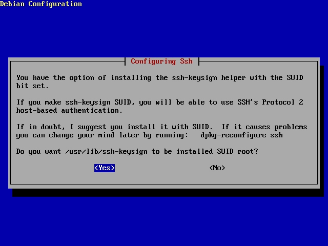 ssh-keysign 을 SUID root 로 설치할 것인지를 물어보고 있다. 'Yes' 선택한다.