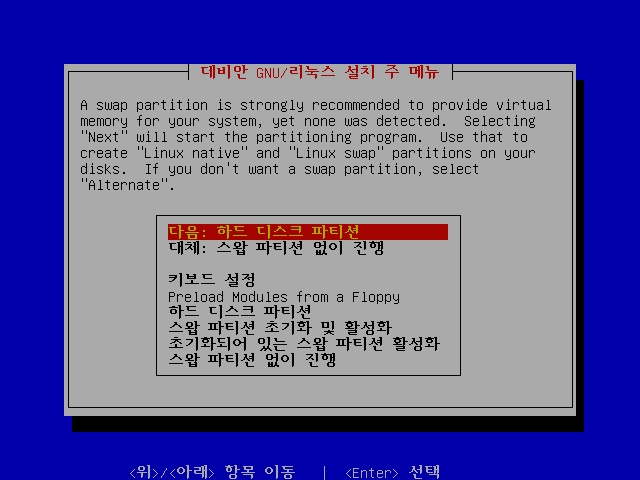이제 본격적인 설치라고 봐도 좋다. 하드디스크 파티션을 지정해주어야 한다.