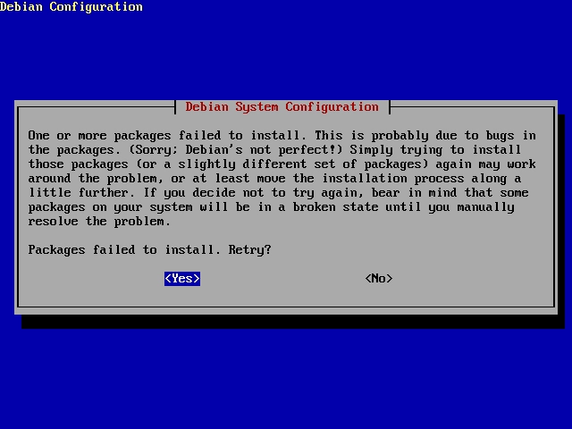 실패한 패키지를 다시 설치할 것인지를 묻고 있다. 여기서는 'No' 선택한다. '데비안은 완벽하지 않다!' 라는 메세지가 참 재미있다.