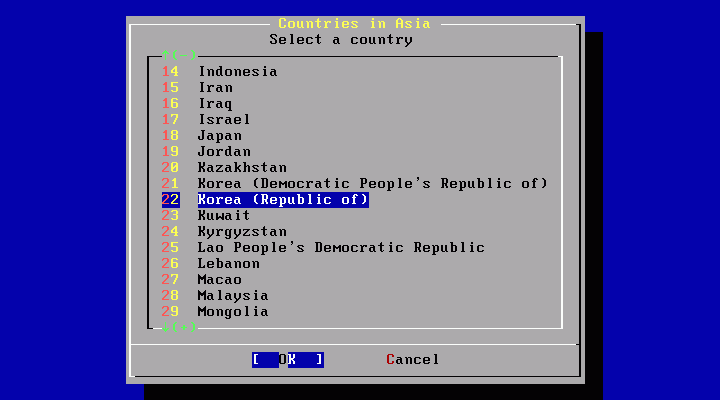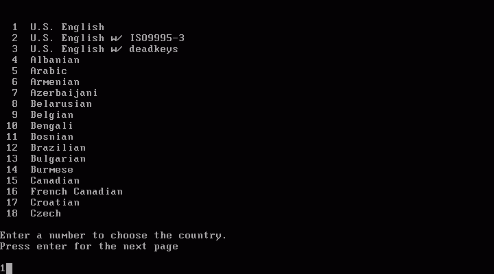 키보드 언어를 설정하는 부분이다. 'Korean' 이 없으므로, '1. U.S. English' 을 선택한다.