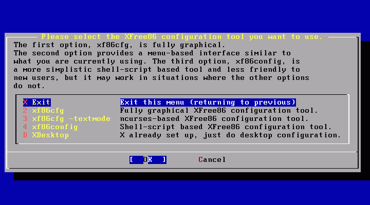 X server 를 설치하기 위해 설정을 해주어야 한다. 모두 X server 설정을 위한 도구지만, 각각 설정하는 방법들이 다르다. 나는 4번(xf86config)을 선택했다.