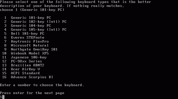 키보드 설정이다. '1. Generic 101-key PC' 선택한다.