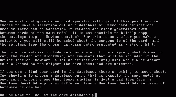 그래픽 카드를 설정하는 부분이다. 자신의 그래픽카드의 정보를 정확히 알고 있다면, 굳이 xfree86 이 지원하는 그래픽 카드 목록을 안봐도 되겠지만 보는 것을 강력 추천한다.