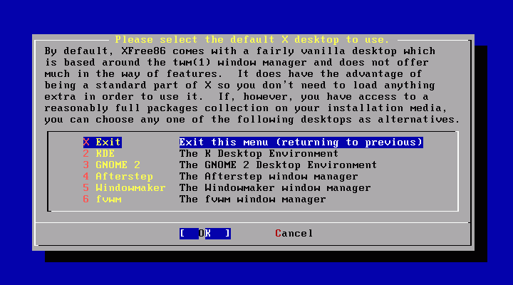 X Manager 를 선택할 차례다. 프비는 많은 X Manager 를 지원하고 있다. 여기서는 'GNOME 2' 선택했다.