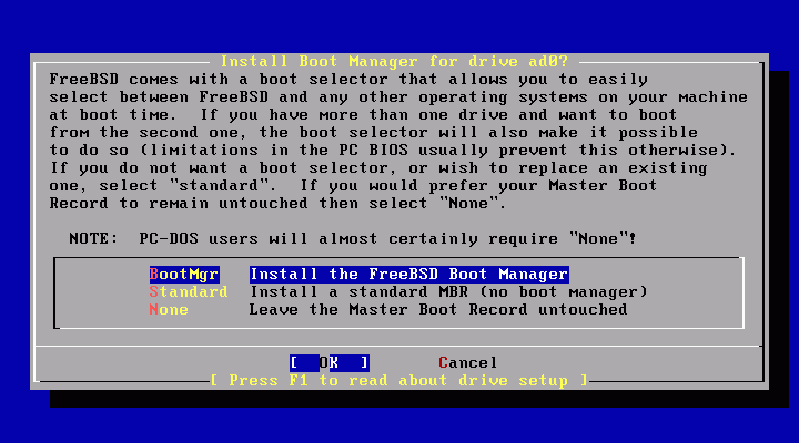 부트로더 설정 화면이다. 여기서는 하드에 프비만 설치를 할 것이기 때문에 'Standard' 를 선택한다. 만일 동일 하드에 다른 파티션에 다른 OS 가 설치되어 있다면, 'BootMgr' 이나 'None' 을 선택한다.