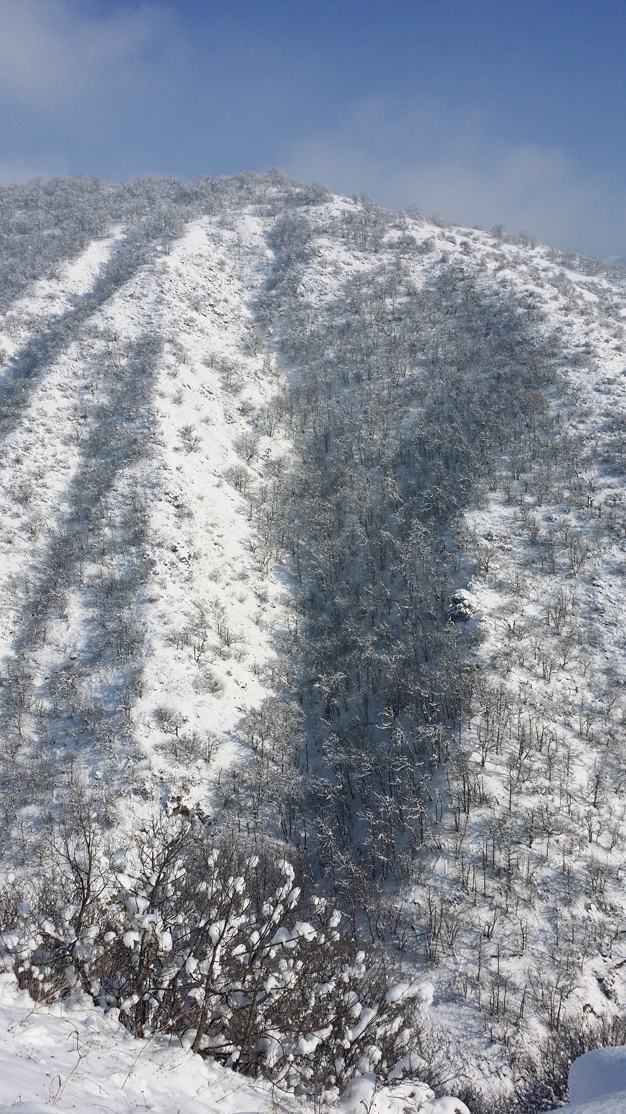 오늘의 루트는 본격적인 업힐 구간이다. 600m 에서 시작해 2500m 까지 올라야 한다. 인도도 갓길도 없는 왕복 1차선 도로가 오르막 산 길을 따라 이어져 있다. 길 양쪽에는 무릎 높이까지 쌓인 눈이 펼쳐저 있다. 해가 비치는 곳은 상태가 그럭저럭 괜찮지만, 그늘이 진 곳은 눈이 녹지 않아 빙판길이다. 불행 중 다행인 것은 다행히 오가는 차량들이 별로 없다는 것. 길의 상태를 보면 누구라도 이곳에서 운전을 하고 싶지는 않을 것 같다.