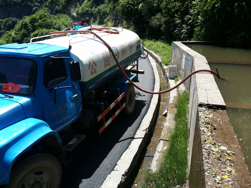 <도로 한켠에는 산에서 내려오는 물을 모아두는 곳이 있어서, 급수차가 여기서 물을 채우고있다>