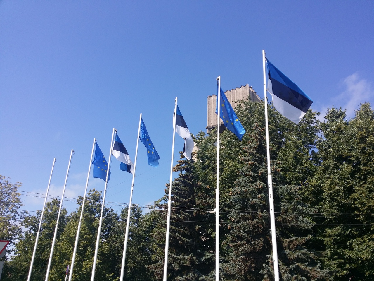 국경 검문소 옆에 펄럭이는 에스토니아 국기(처음에는 국기인지도 몰랐다)와 EU 국기.