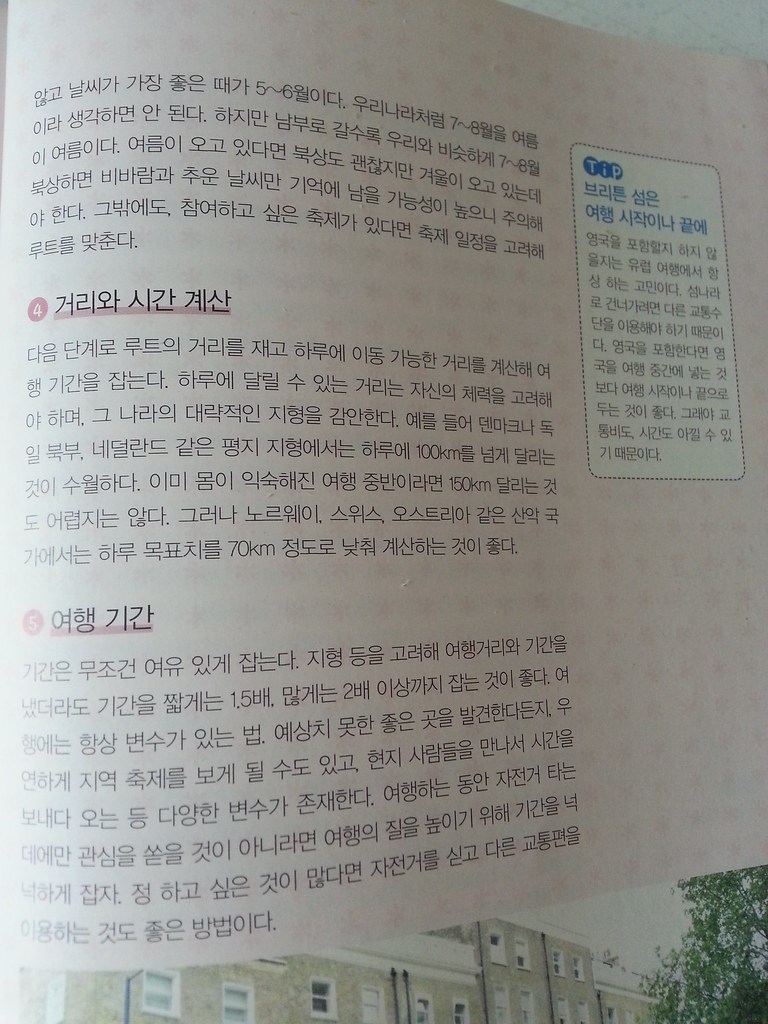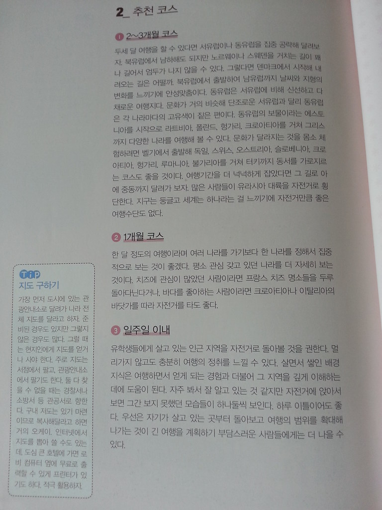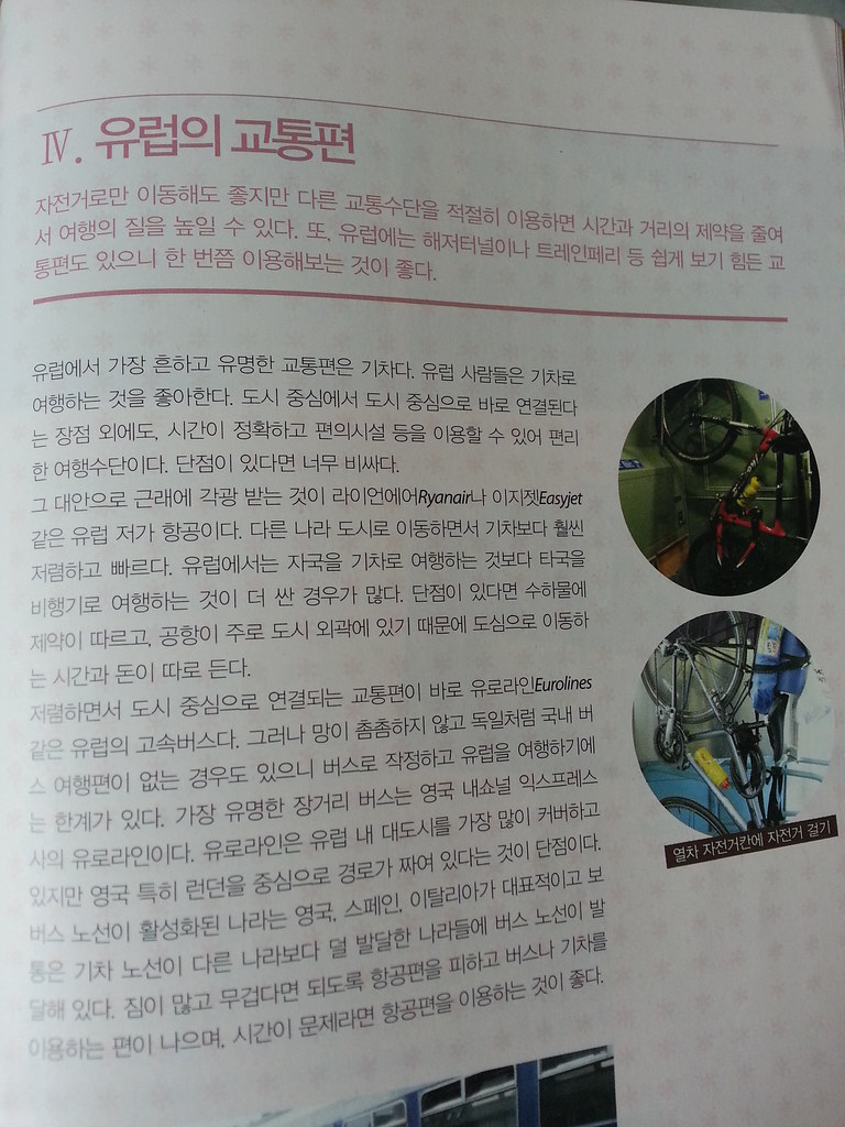 아래는 '발칙한 유럽여행' 이라는 책에 나온 내용을 캡쳐한 것이다. 자전거로 유럽을 여행할 때, 아래 내용을 숙지할 필요가 있다.