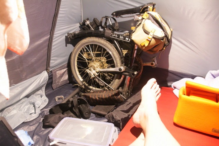 3 인용 텐트인데도, 자전거를 들여놓으면 딱 누울 공간만 남는다.
