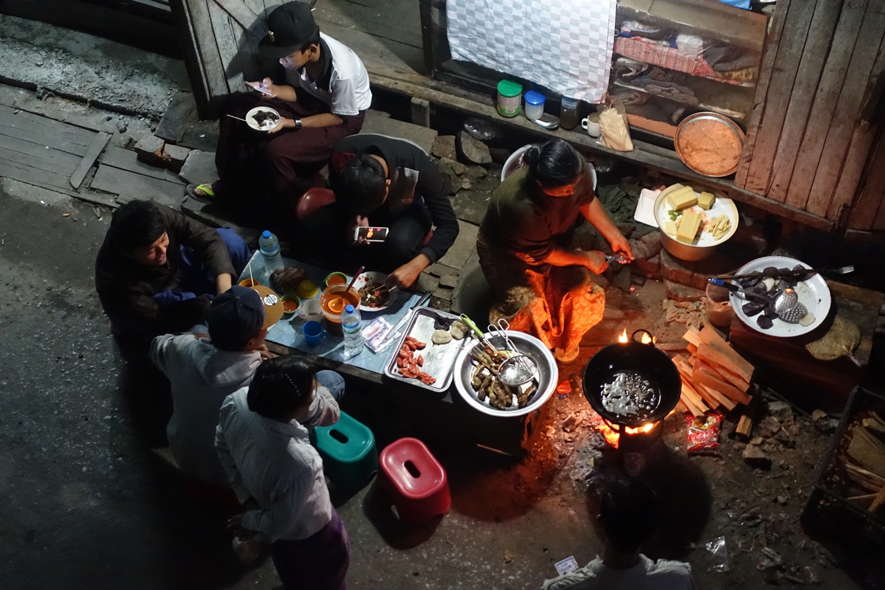<숙소에서 내려다 본 거리 식당. 각종 꼬치류를 튀겨서 판다>