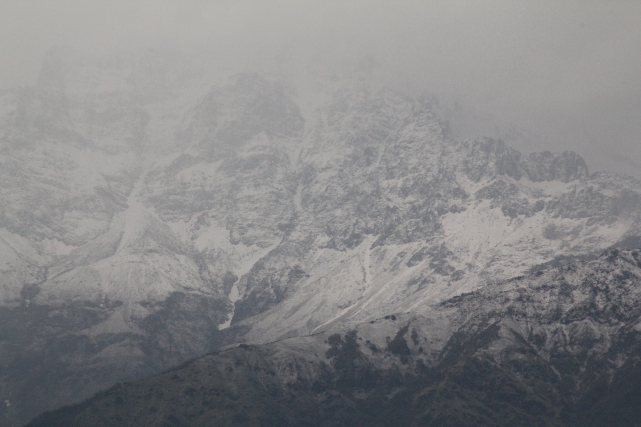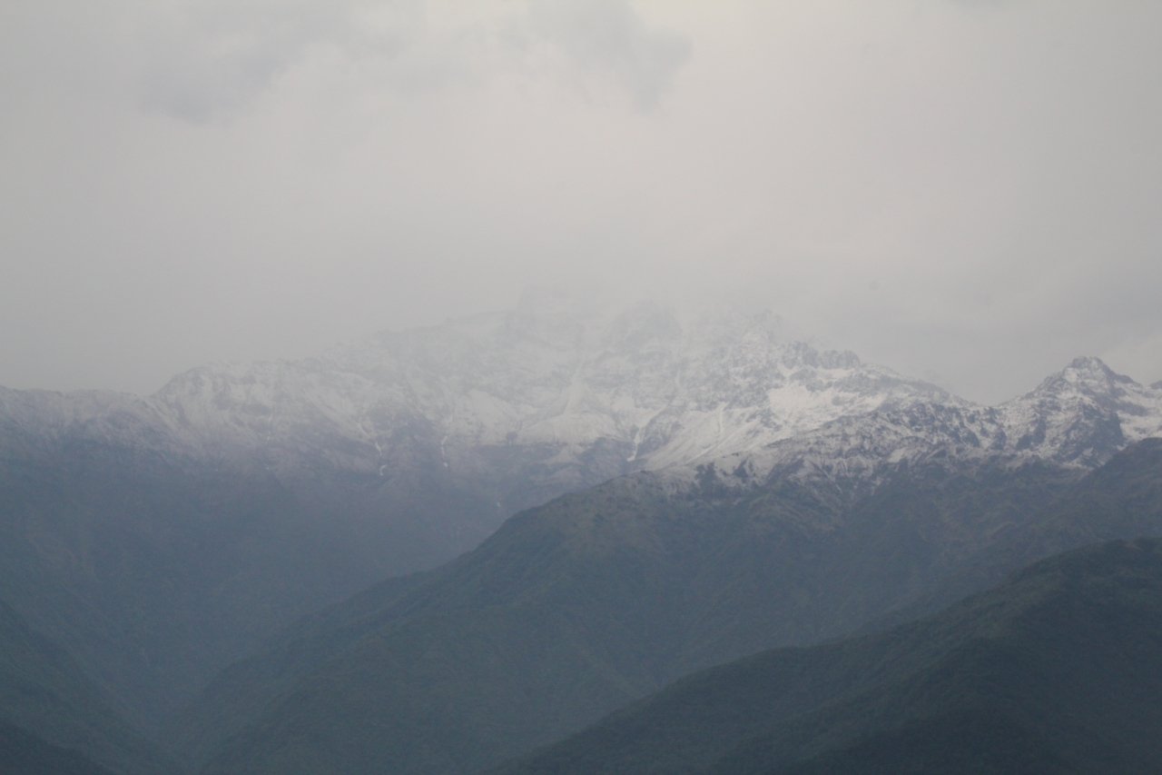 평소에는 경험하지 못할 정도의 비바람이 한동안 몰아쳤다. 어느정도 잦아 들었을 때, 식당 밖을 나와보니, 아까전에는 보이지 않던 설산이 조금씩 보이기 시작했다. 비구름이 거치면서 모습을 드러낸 것이다.